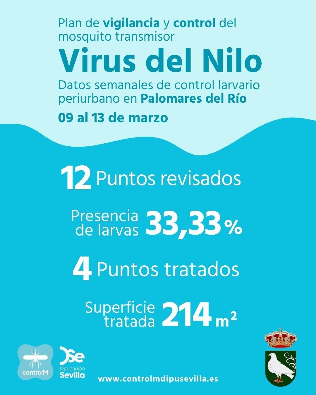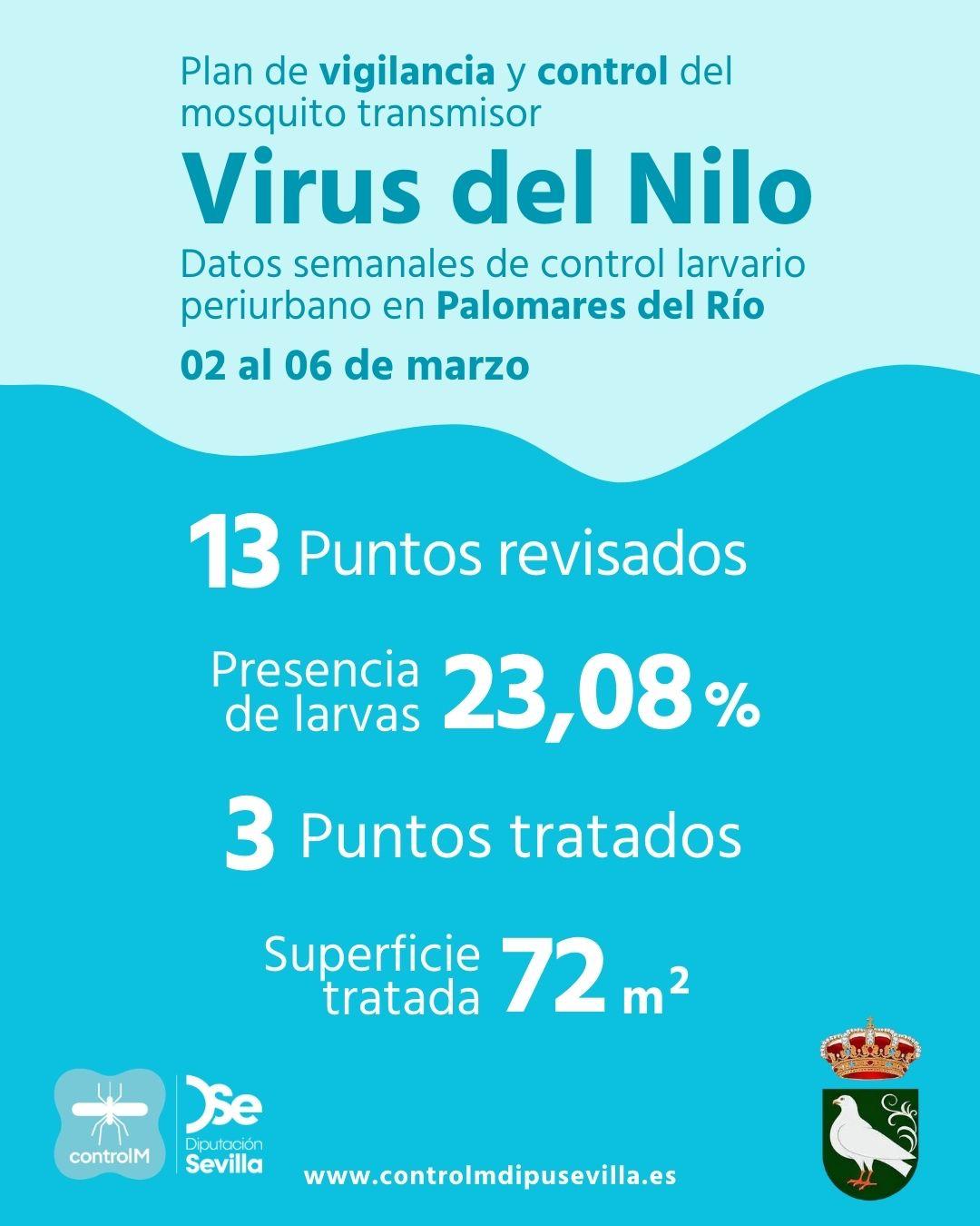 Además, la Diputación Provincial de Sevilla, a través de su plan de control de zonas periurbanas, está llevando a cabo desde la semana del 2 al 6 de marzo hasta la actual la revisión de 25 puntos, realizando tratamiento en 7 de ellos por presencia de larvas.