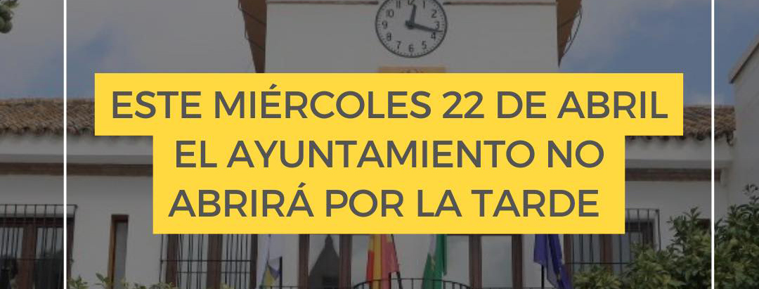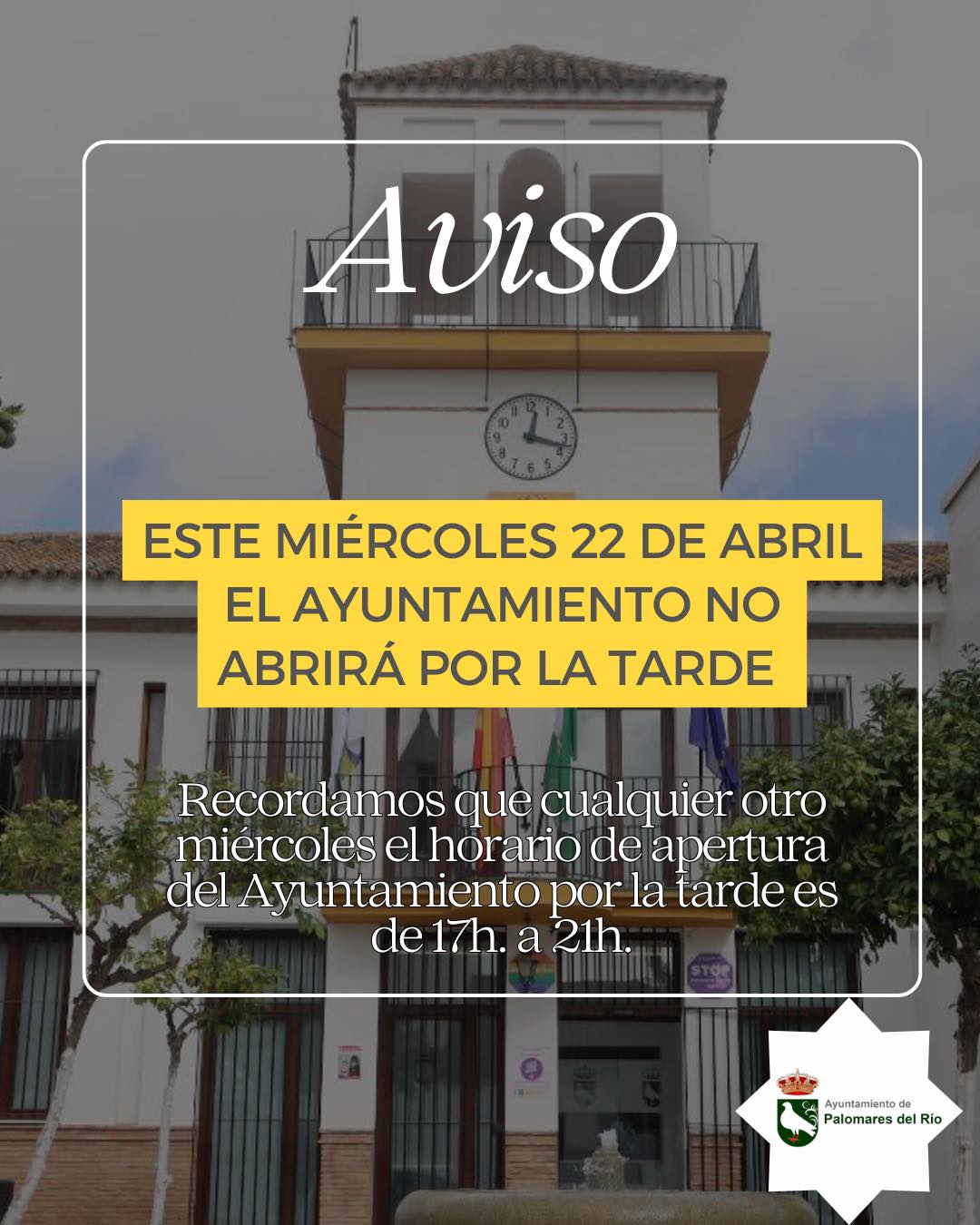 Este miércoles 22 de abril, el Ayuntamiento de Palomares del Río permanecerá cerrado en horario de tarde.