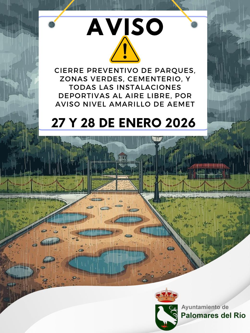 Ante el aviso meteorológico de nivel amarillo previsto para los días 27 y 28 de enero, el Ayuntamiento informa del cierre preventivo de parques, zonas verdes y la suspensión de actividades deportivas al aire libre.