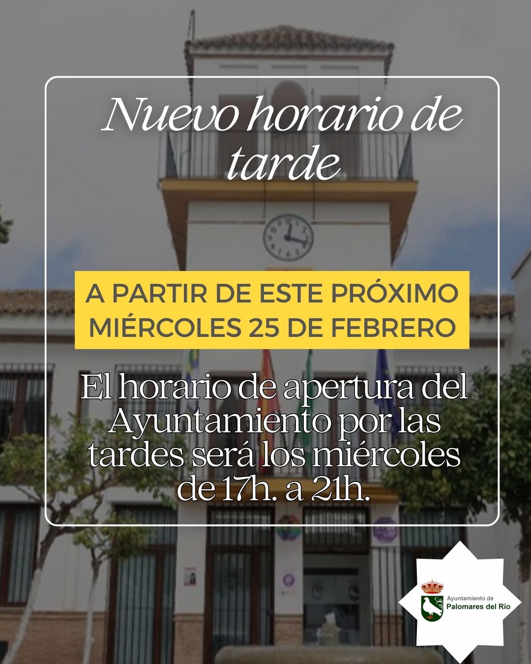A partir del próximo miércoles 25 de febrero, el Ayuntamiento de Palomares del Río abrirá en horario de tarde siempre los miércoles, de 17:00 a 21:00 horas.
