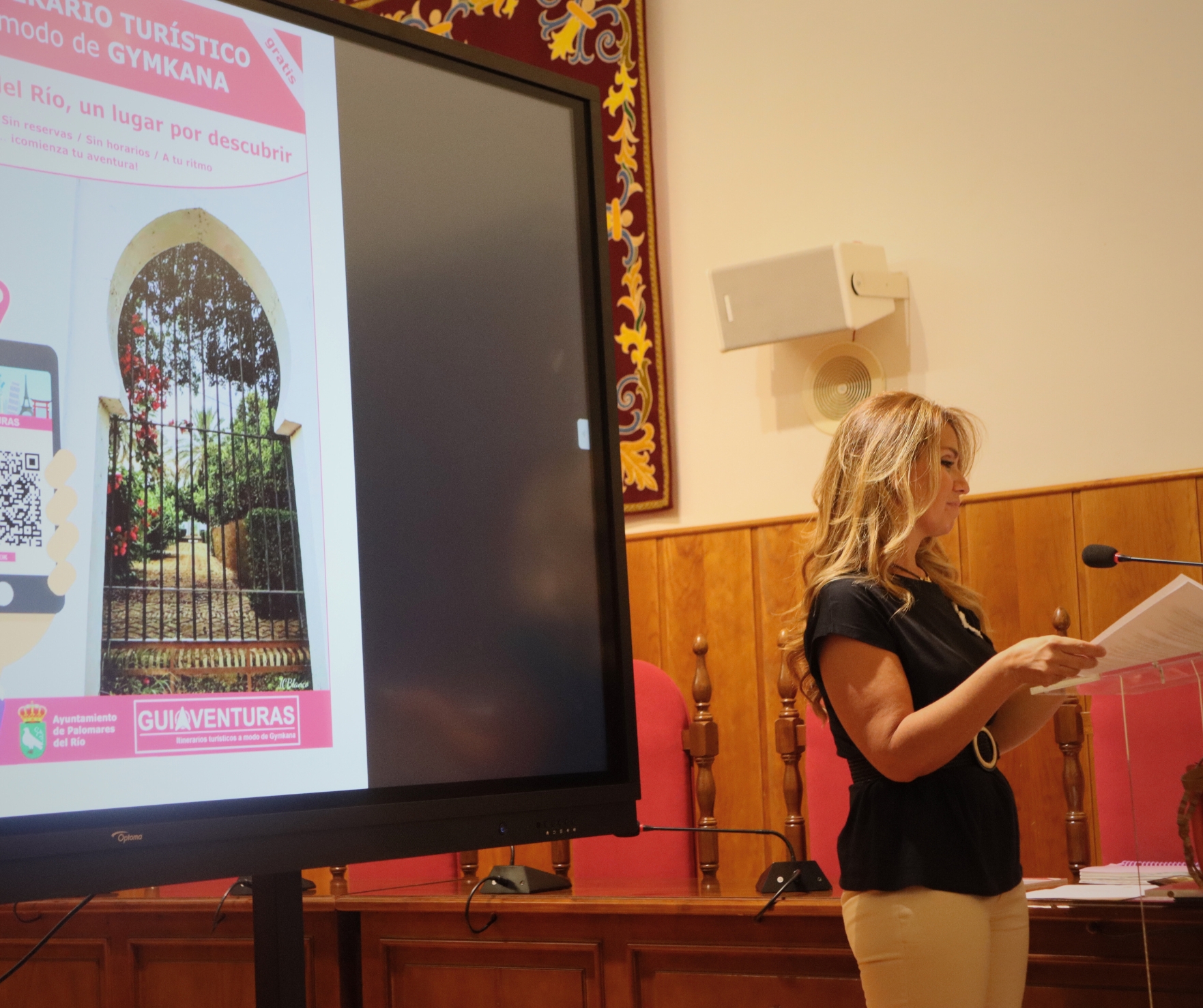Eva Monge, junto al alcalde, Manuel Benjumea, también han tenido la oportunidad de presentar una experiencia totalmente innovadora, la Gymkhana Turística Digital creada por Guiaventura.