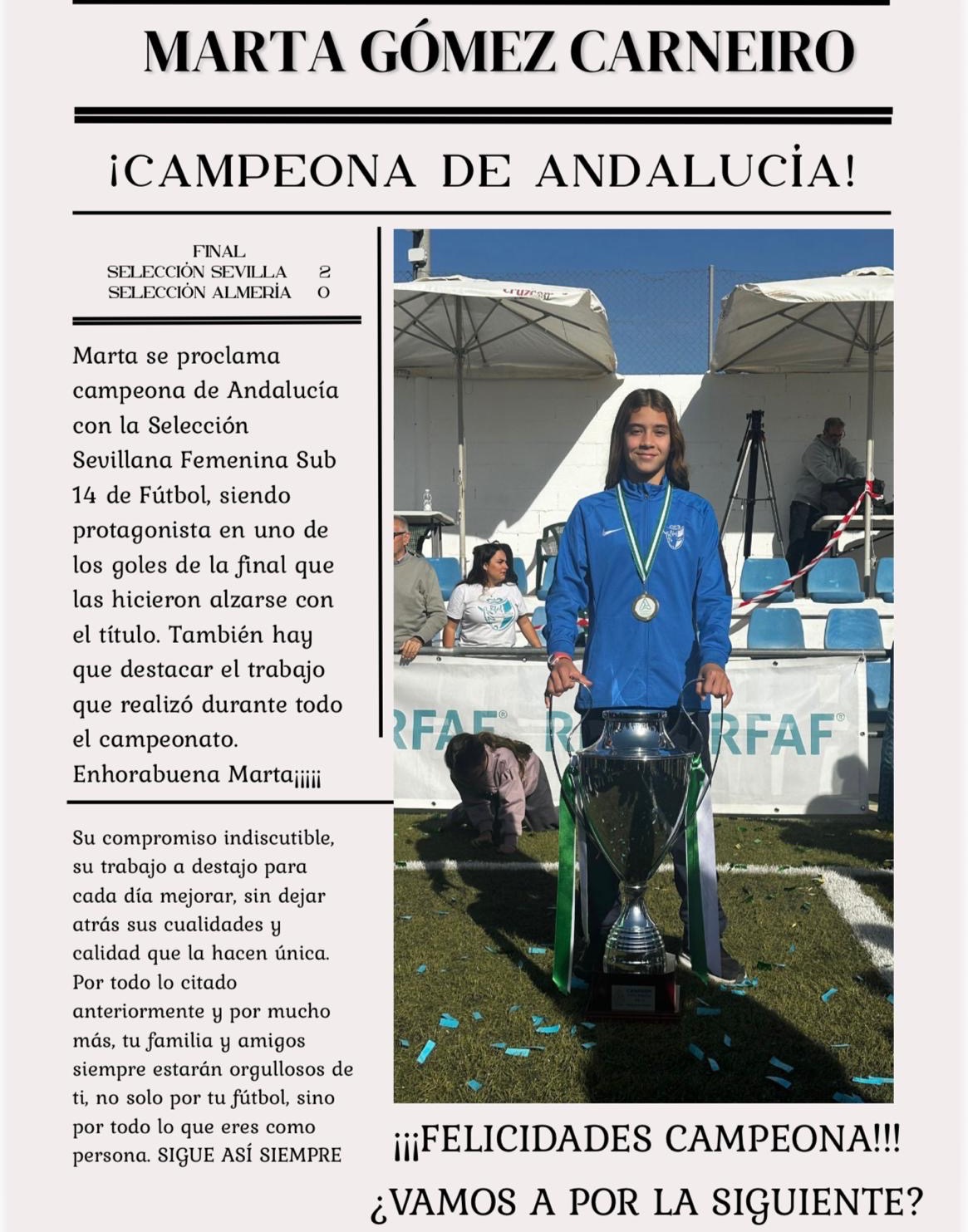 Nuestra joven vecina ha hecho historia proclamándose campeona de Andalucía con la Selección Sevillana Femenina Sub-14, en una final donde el equipo se impuso por 2-0 ante la Selección de Almería.