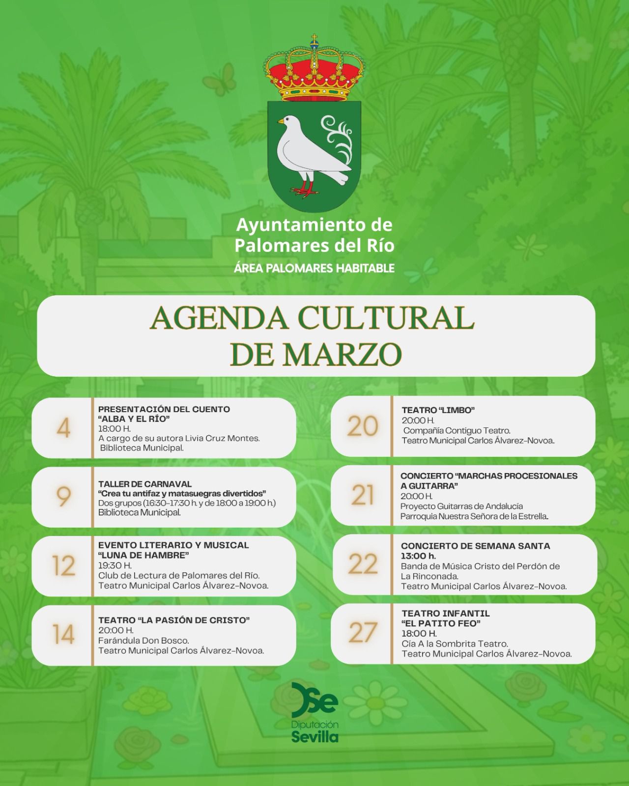 Marzo llega a #PalomaresdelRío cargado de cultura, creatividad y encuentros como presentaciones literarias, talleres para los más pequeños, teatro, música y propuestas para vivir la antesala de la Semana Santa. Te dejamos la agenda organizada para este mes por el área de Palomares Habitable: