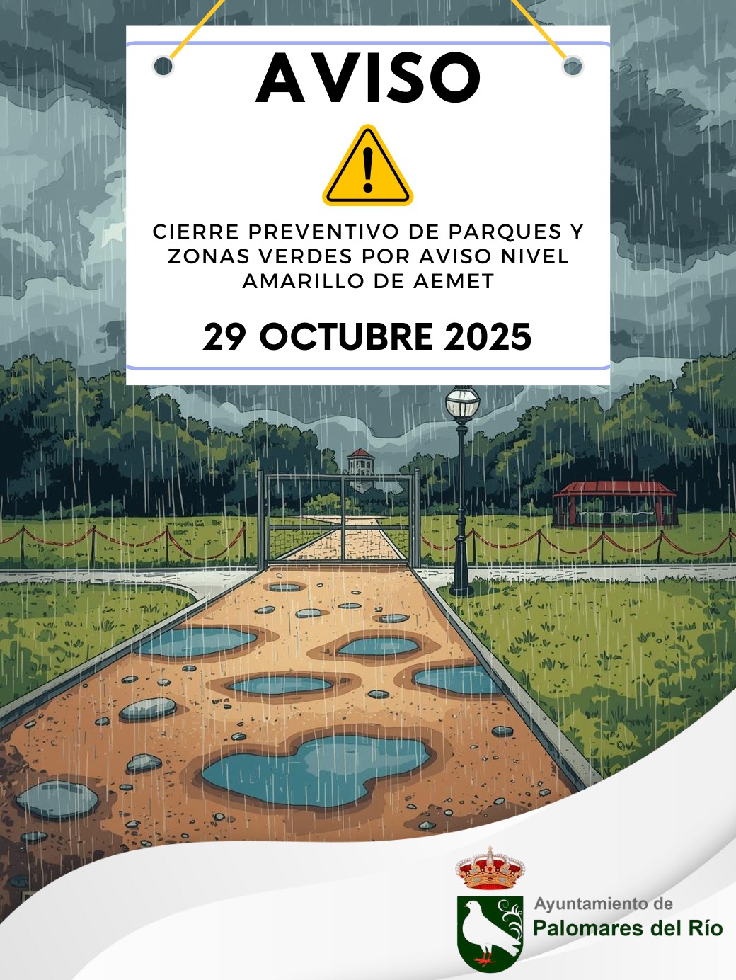 Ante el aviso amarillo y naranja emitido por AEMET, el Ayuntamiento de Palomares del Río informa que mañana permanecerán cerrados los parques y zonas verdes como medida preventiva para garantizar la seguridad de nuestros vecinos y vecinas.