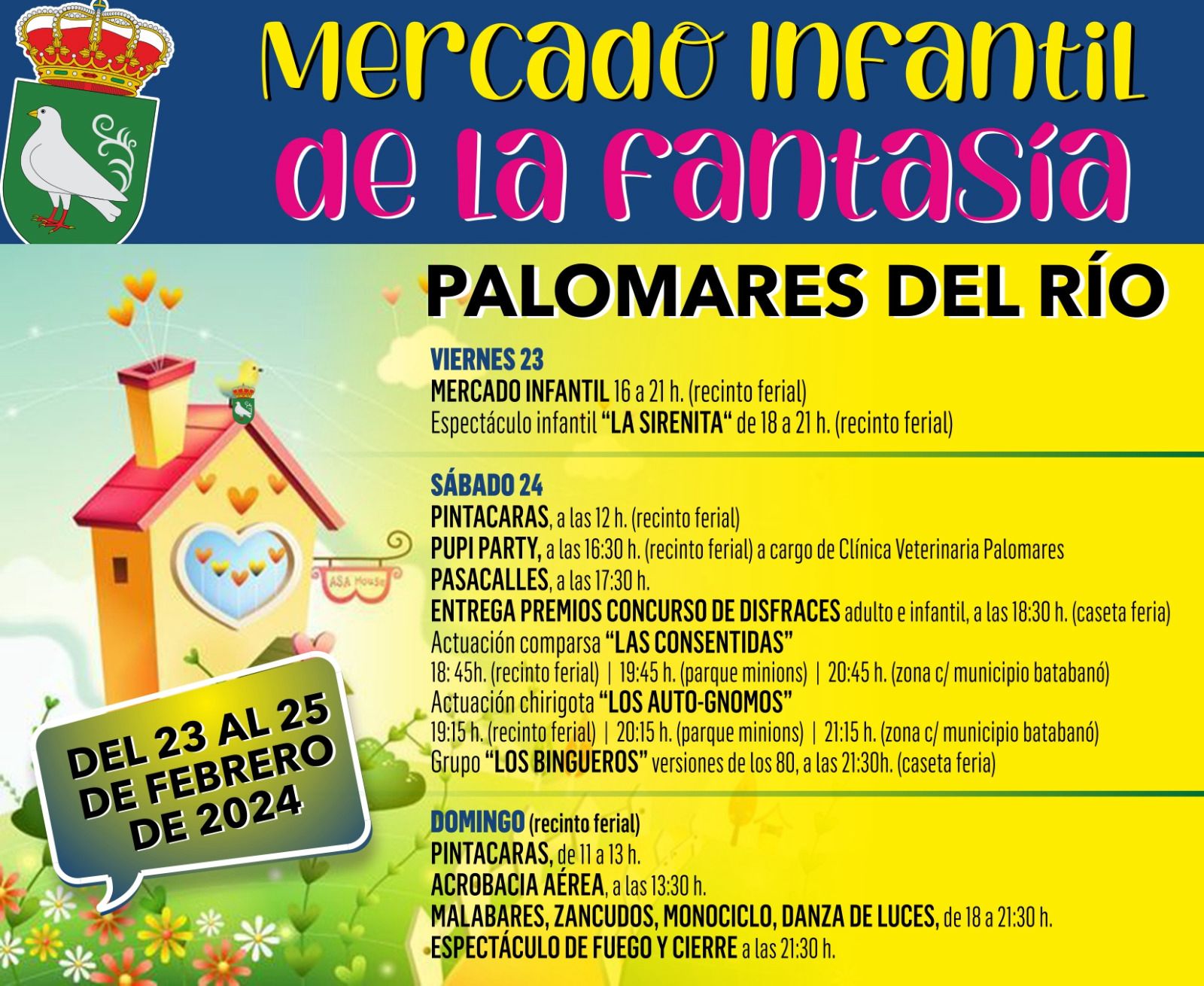 El Ayuntamiento de Palomares del Río organiza el Mercado Infantil de la Fantasía, en el que se instalarán en el Recinto Ferial puestos y tenderetes con material de temática diversa y donde se podrá disfrutar de los juegos, atracciones y actuaciones programadas.