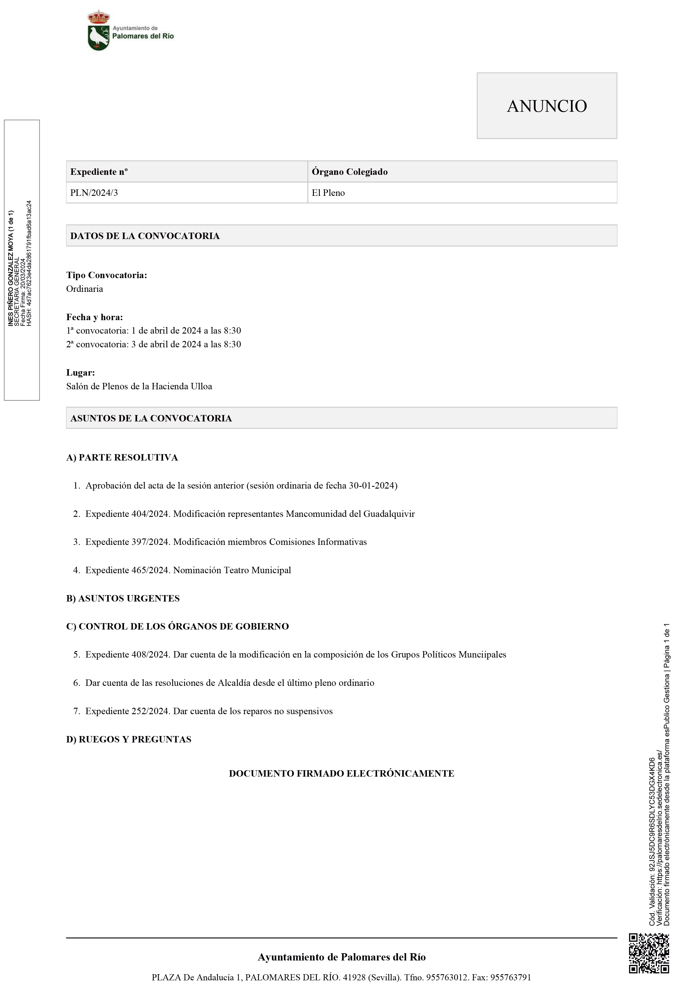 PALOMARES DEL RÍO - 01/04/2024 8:30H - PLENO ORDINARIO