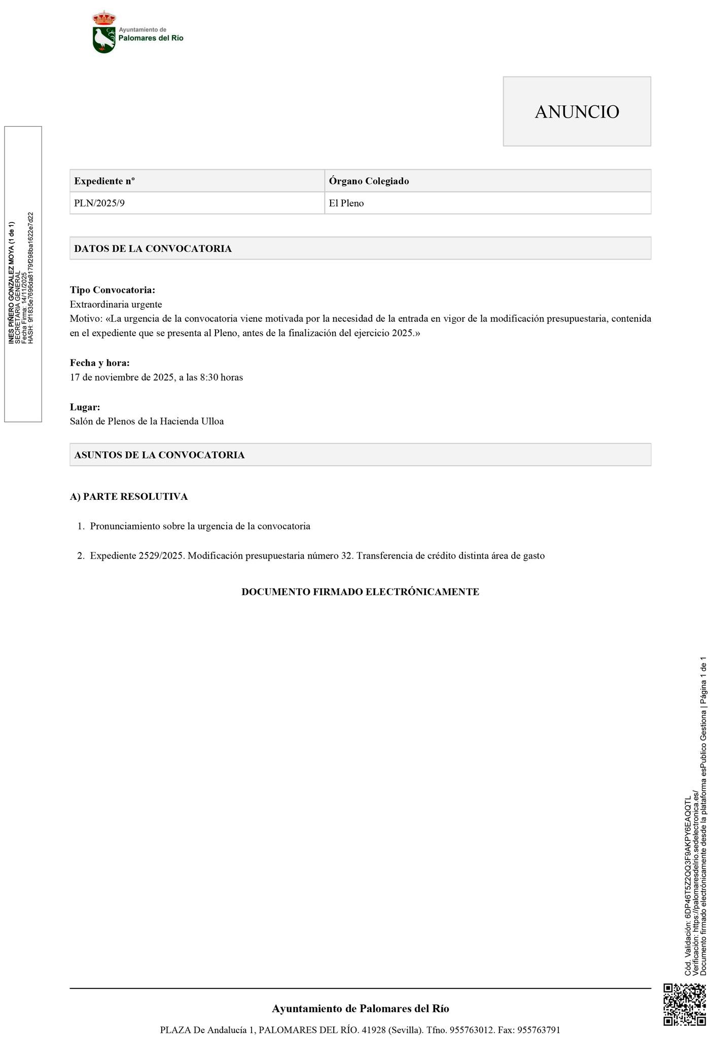 PALOMARES DEL RÍO - 17/11/2025 8:30H - PLENO EXTRAORDINARIO URGENTE