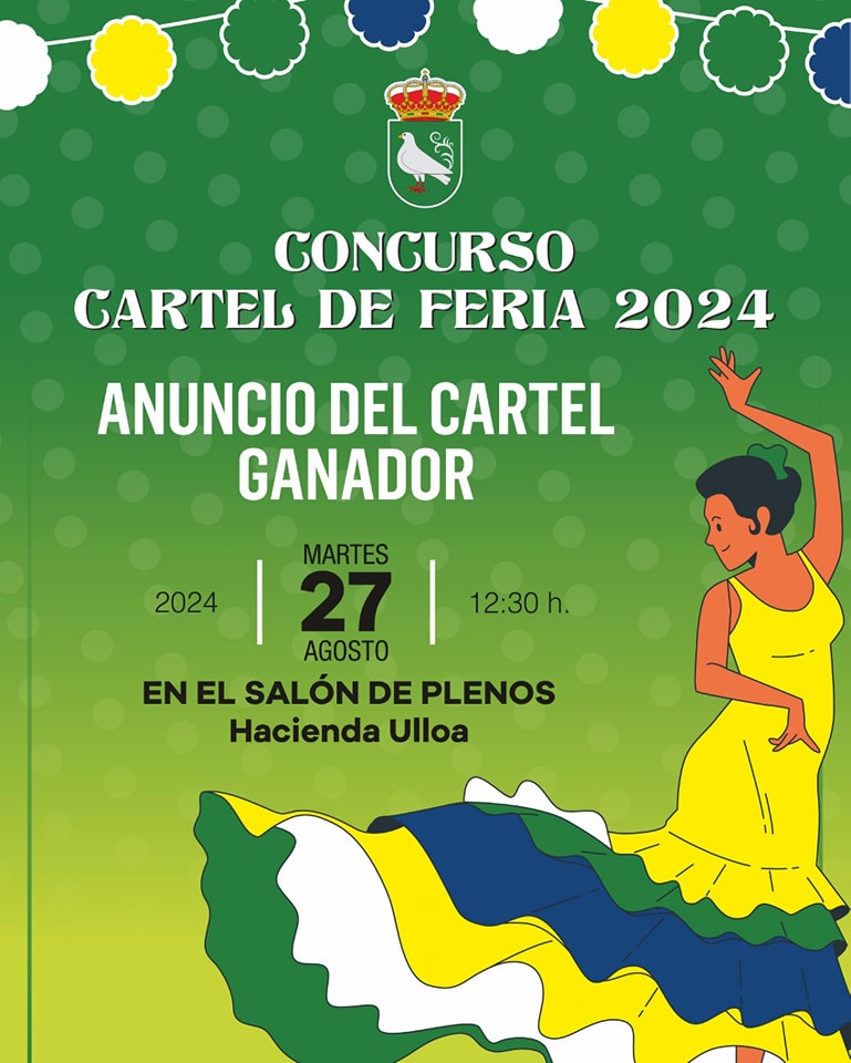 Mañana 27 de agosto, a las 12:30 horas, en el salón de plenos de la Hacienda Ulloa, se anunciará el cartel de la Feria de Palomares del Río 2024.