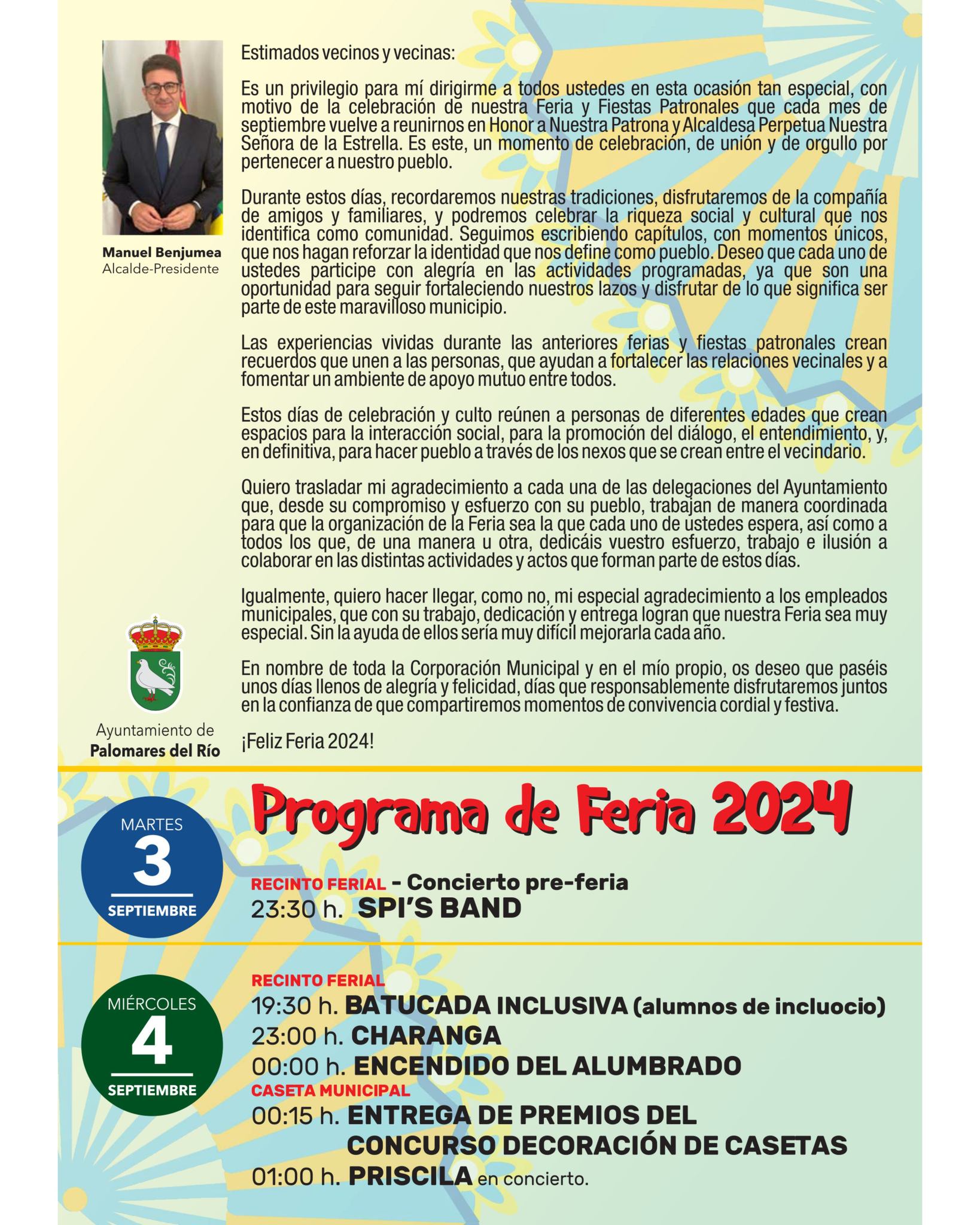 Programa de actividades y Saluda de alcaldía de la Feria de Palomares del Río 2024