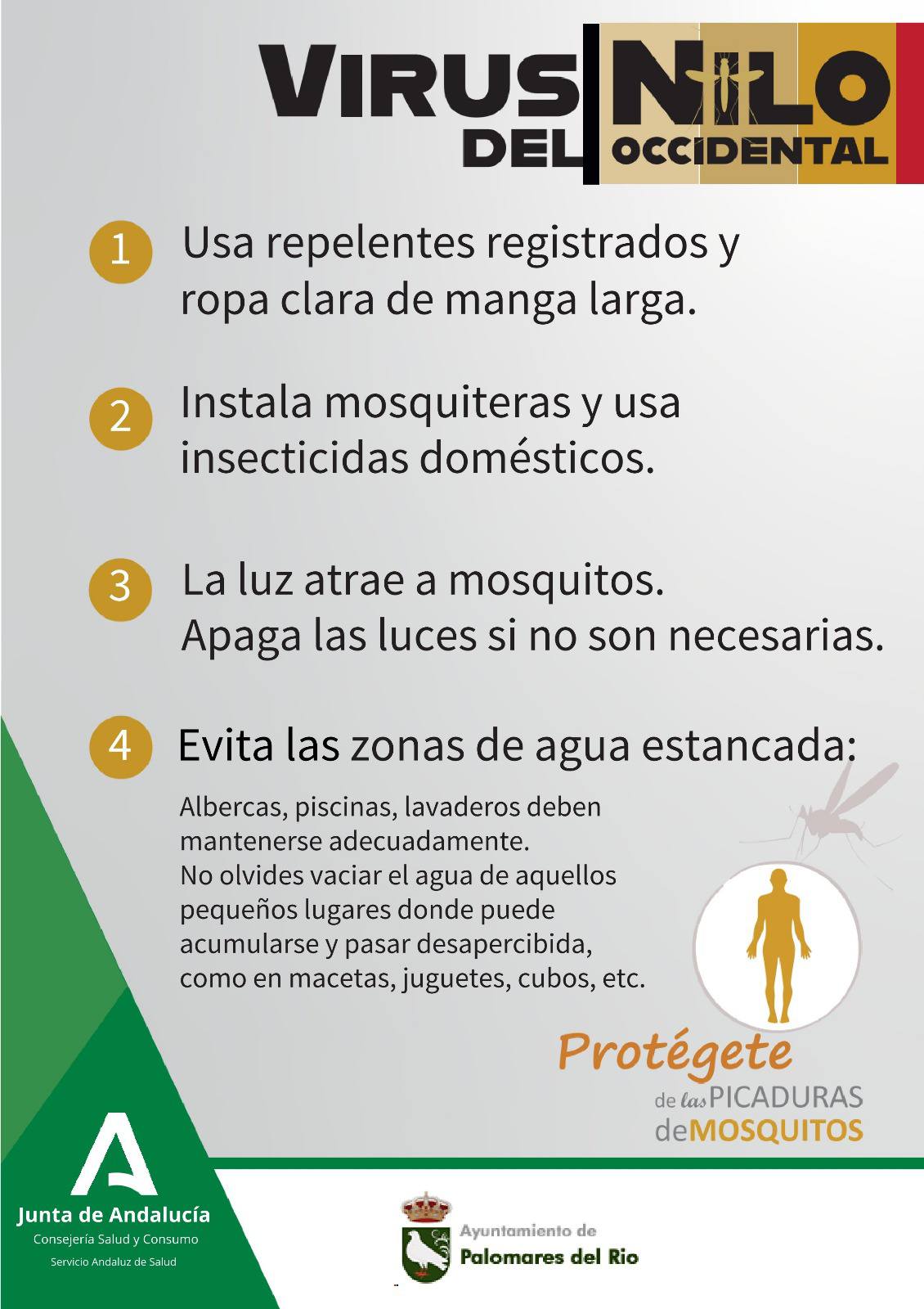 Desde el Ayuntamiento Palomares del Río te recordamos cómo prevenir las picaduras de mosquitos y reducir el riesgo del #VirusdelNilo Occidental: