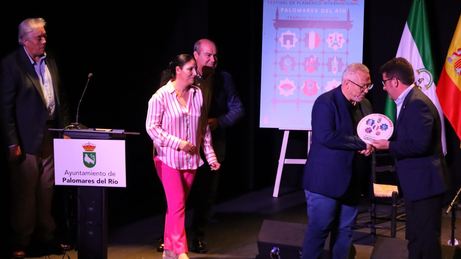El momento institucional de la noche llegó con la entrega y mención especial a Luis Guillermo Cortés, presidente de la Escuela de Flamenco de Andalucía, por su destacada labor en la proyección internacional del flamenco. El reconocimiento fue entregado por el alcalde de Palomares del Río, Manuel Benjumea.