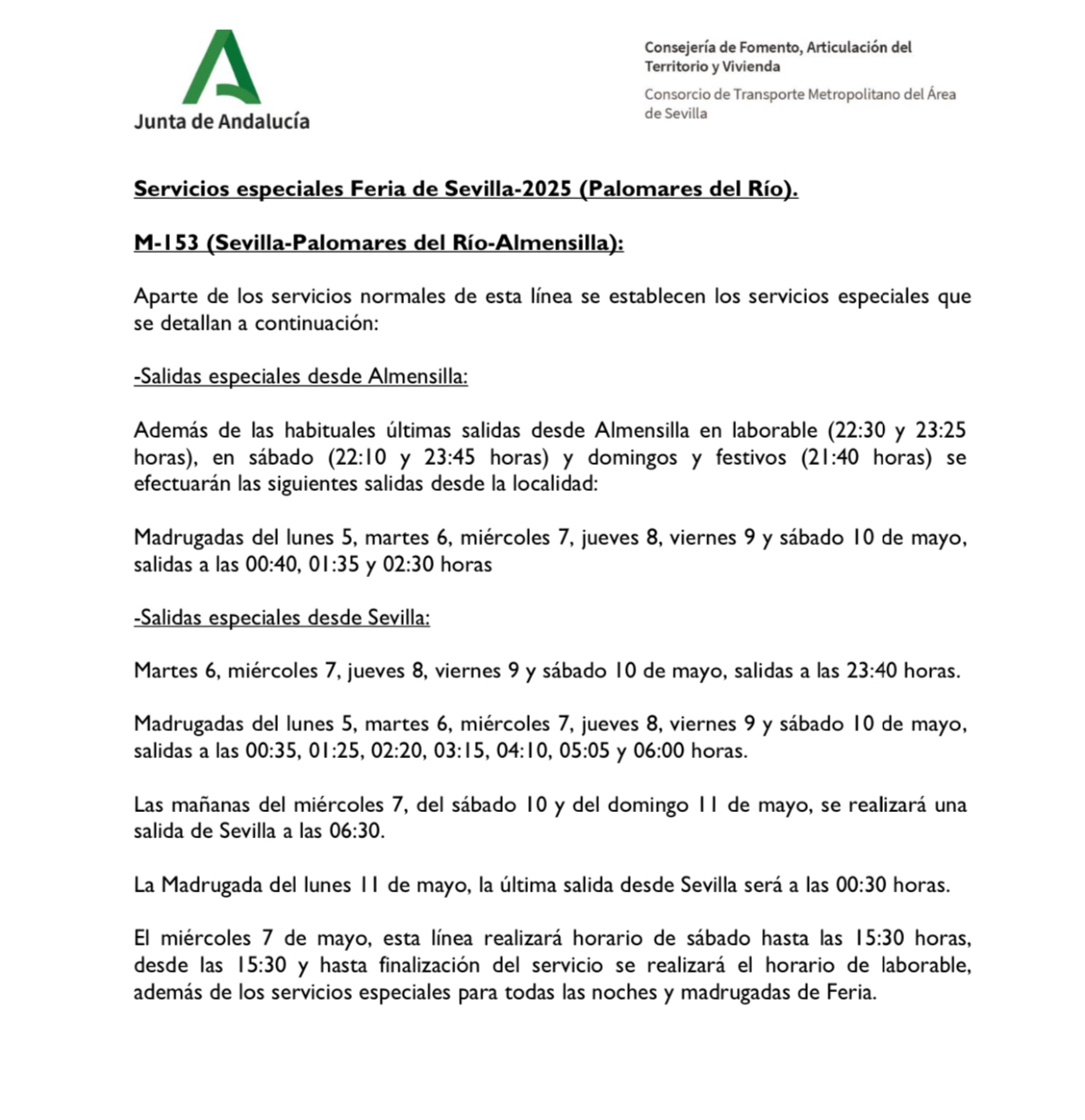 Desde el lunes 5 de mayo, la línea M-153 (Sevilla - Palomares del Río - Almensilla) contará con refuerzos especiales para facilitar el acceso y regreso de la Feria de Sevilla.