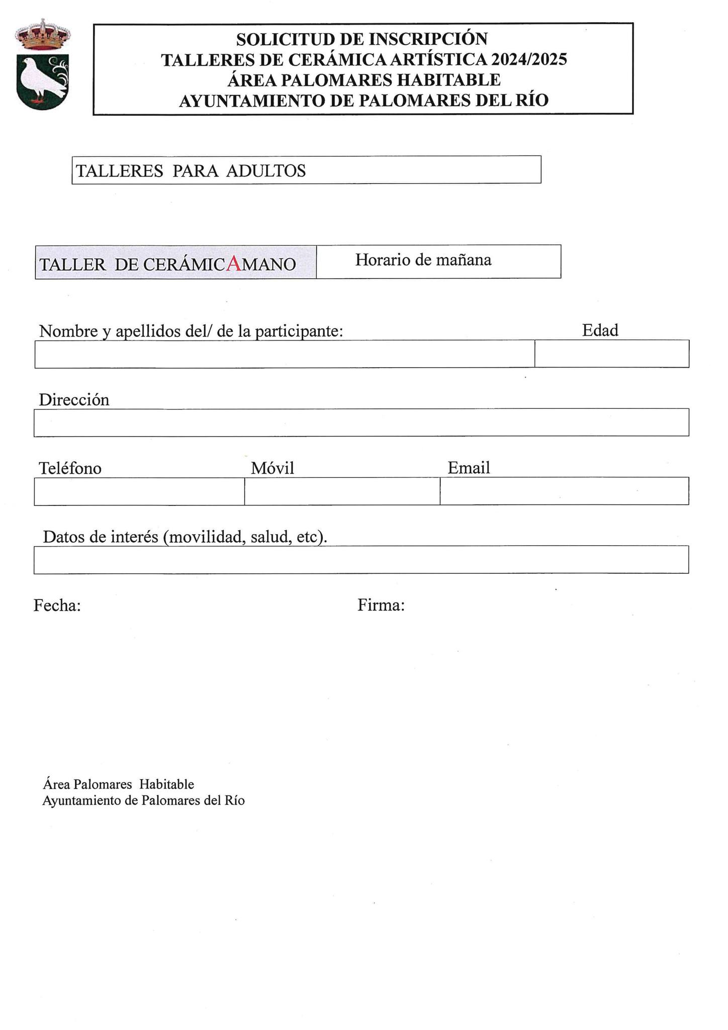El Área Palomares Habitable del Ayuntamiento Palomares del Río informa que se encuentra abierto el plazo de inscripciones para participar en el taller de “CERÁMICA A MANO” 2024-2025.