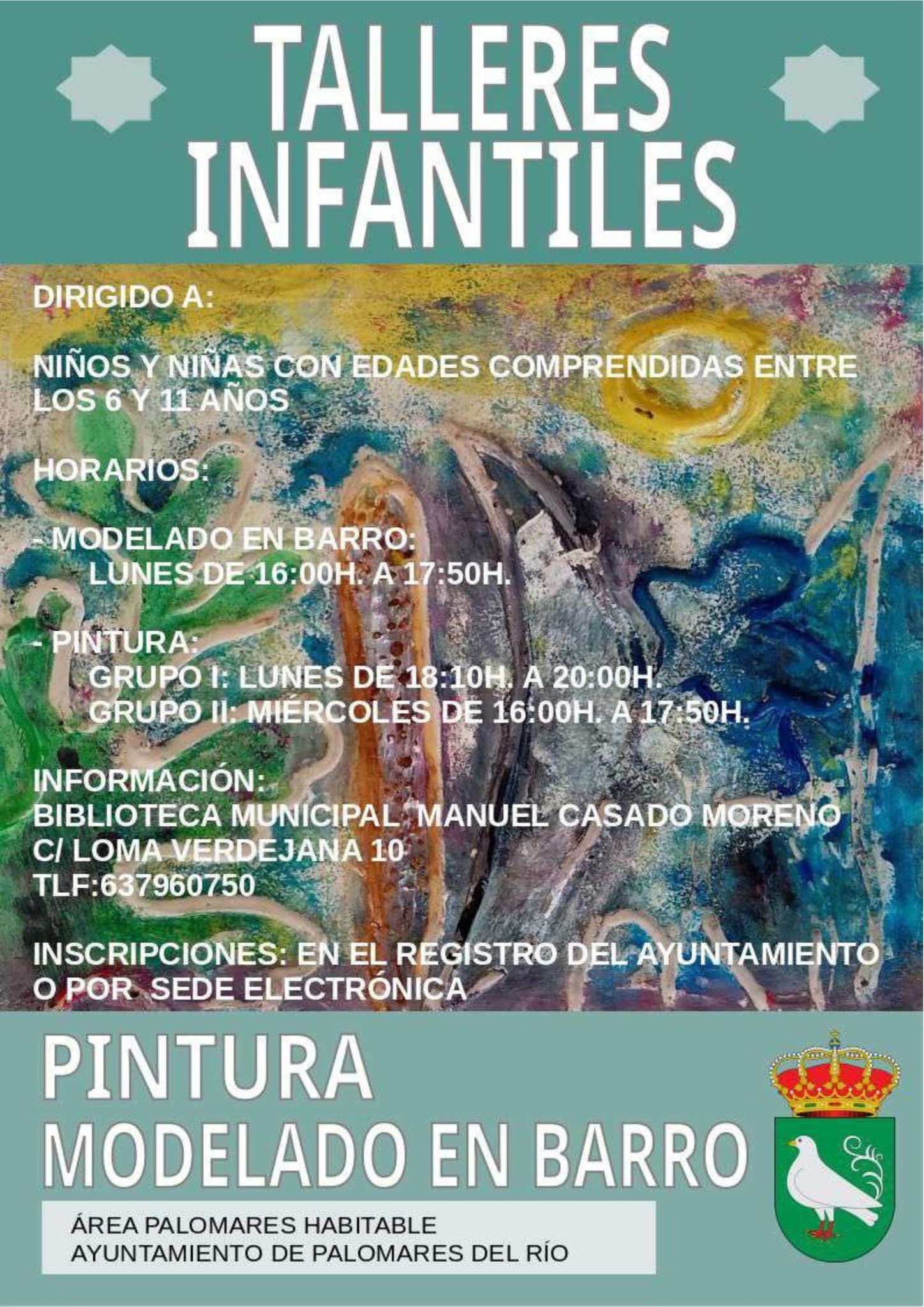 El Ayuntamiento de Palomares del Río pone en marcha un año más desde el Área #PalomaresHabitable, los Talleres Infantiles y Juveniles municipales que constan de los módulos de Pintura y Modelado ofertados para los niños/as con edades comprendidas entre los 6 y 11 años, y el Taller de Artes Plásticas para los/as jóvenes de 12 a 25 años de edad de nuestra localidad.