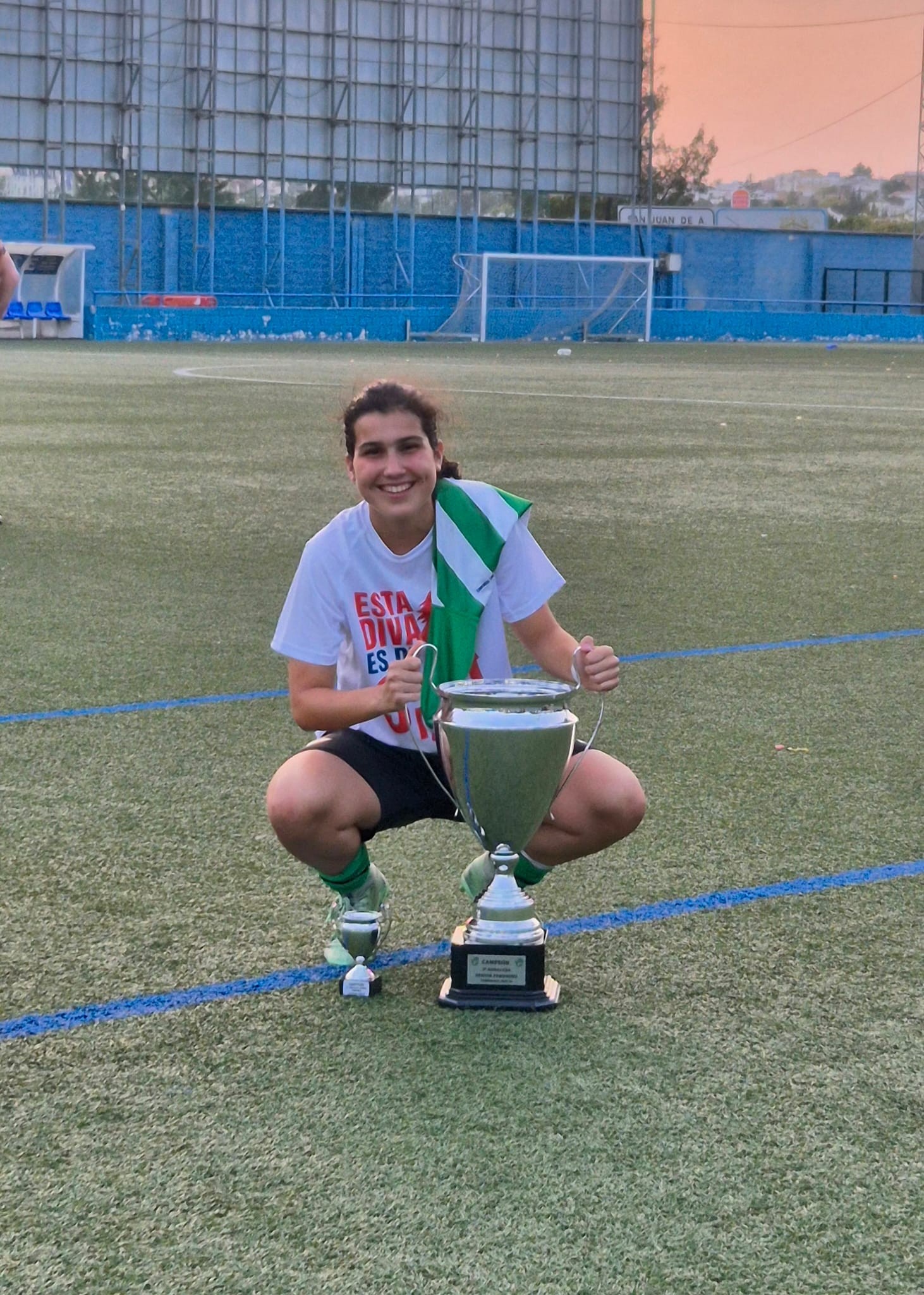 Tere Irene, quien a pesar de su edad de cadete se ha consolidado como titular en el equipo senior del CFF Ciudad de Dos Hermanas, contribuyendo al éxito de su equipo que ha logrado el campeonato de liga en la categoría senior 2° Andaluza y el ansiado ascenso a tercera división RFEF.