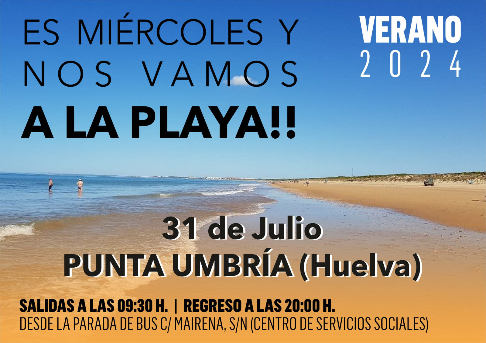 Seguimos con nuestro objetivo del verano, ningún palomareñ@ se quede sin playa con la tercera salida. El próximo miércoles 31 de julio en PLAYA DE PUNTA UMBRÍA (Huelva).