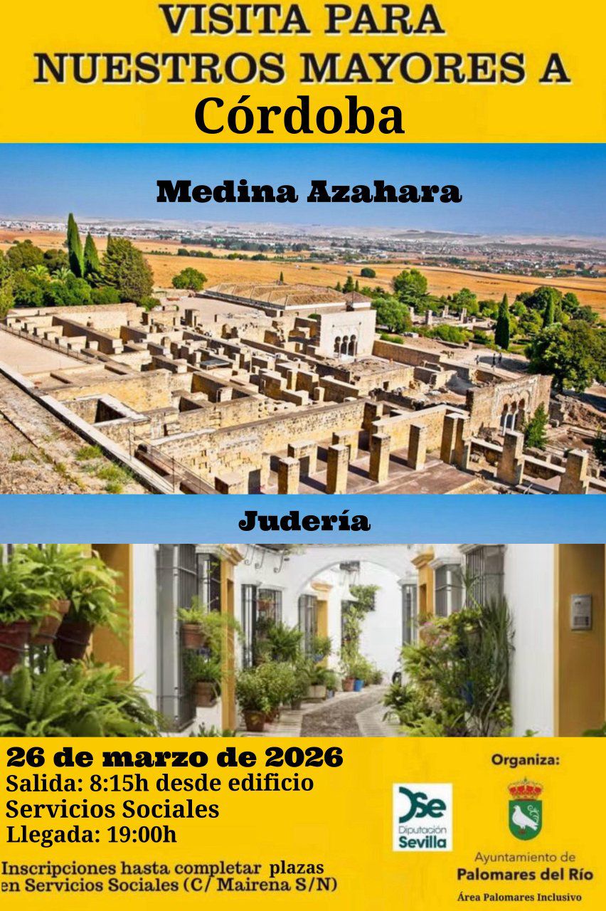 Inscripciones presencialmente en Servicios Sociales hasta completar plazas. (C/Mairena 3-5) o por email serviciossociales@palomaresdelrio.es