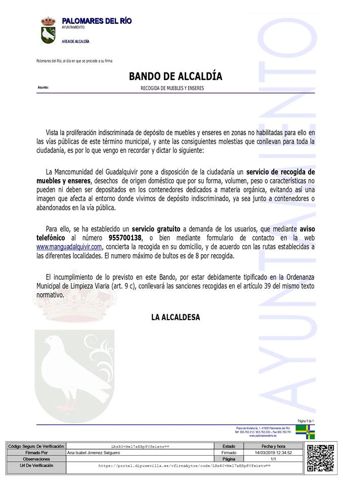 Bando de Alcaldía "Recogida de muebles y enseres"