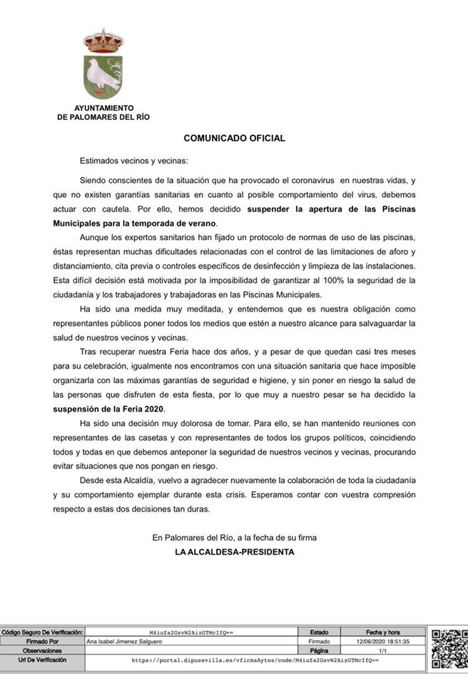 SUSPENSIÓN DE LA APERTURA DE LAS PISCINAS MUNICIPALES PARA LA TEMPORADA DE VERANO 2020, Y SUSPENSIÓN DE FERIA 2020.