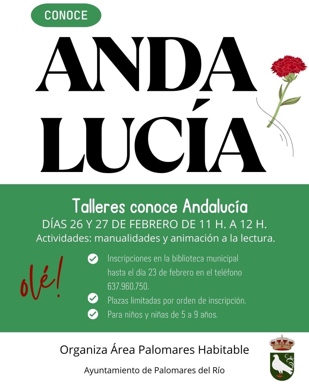 Con motivo del Día de Andalucía, el Área Palomares Habitable organiza la actividad "Conoce Andalucía", dirigida a niños y niñas de entre 5 y 9 años, que tendrá lugar en la Biblioteca Municipal, los próximos días 26 y 27 de febrero.