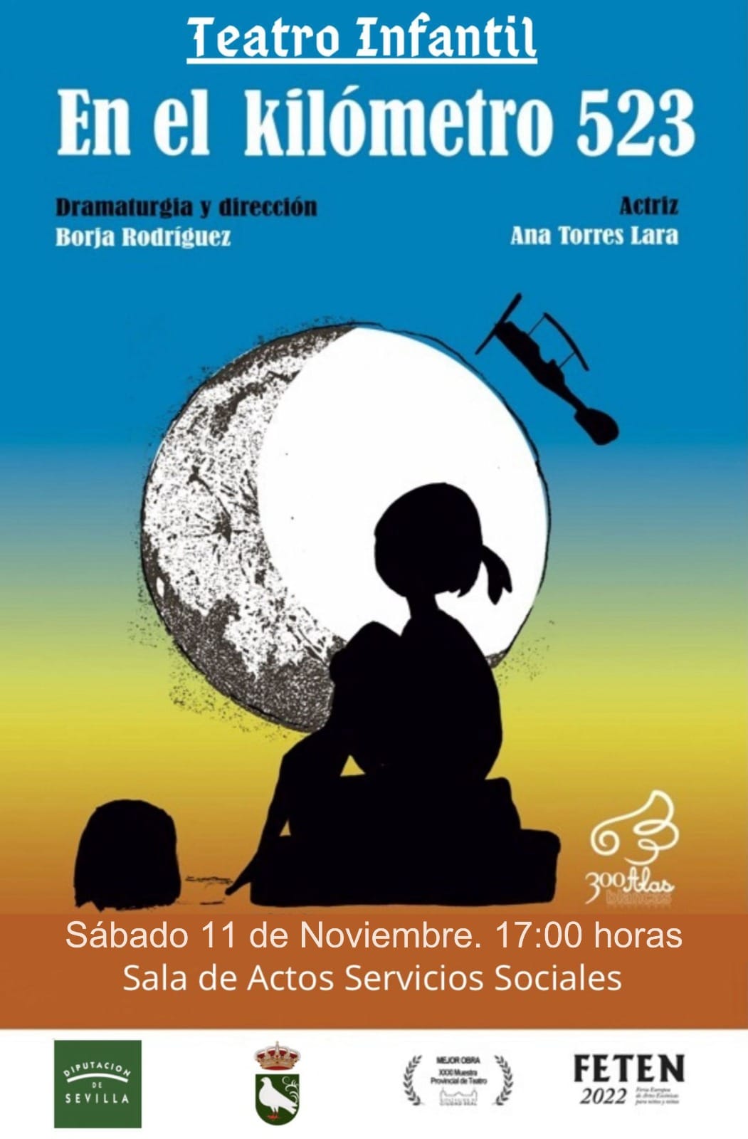 El Área #palomareshabitable en colaboración con la Diputación Provincial de Sevilla, organizan el próximo sábado 11 de noviembre a las 17:00, en el Salón de Actos del Centro de Servicios Sociales, la representación de la obra de teatro infantil “En el Kilómetro 523”, para niños y niñas a partir de 4 años, a cargo de la compañía 300 Alas Blancas.