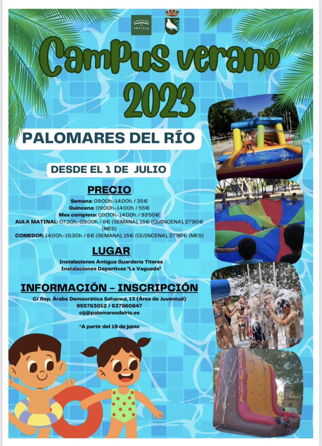 A partir del próximo 19 de junio puedes inscribirte en la *Escuela de Verano*, presencialmente de 9:00 A 13:30h en el Centro de Información Juvenil (C/ Rep. Democrática Árabe Saharaui, 13) , a través de la sede electrónica. Podrán descargar la solicitud a través del canal de telegram (https://t.me/ayuntamientopalomaresdelrio/4695) del Ayuntamiento de Palomares, o desde la misma sede.