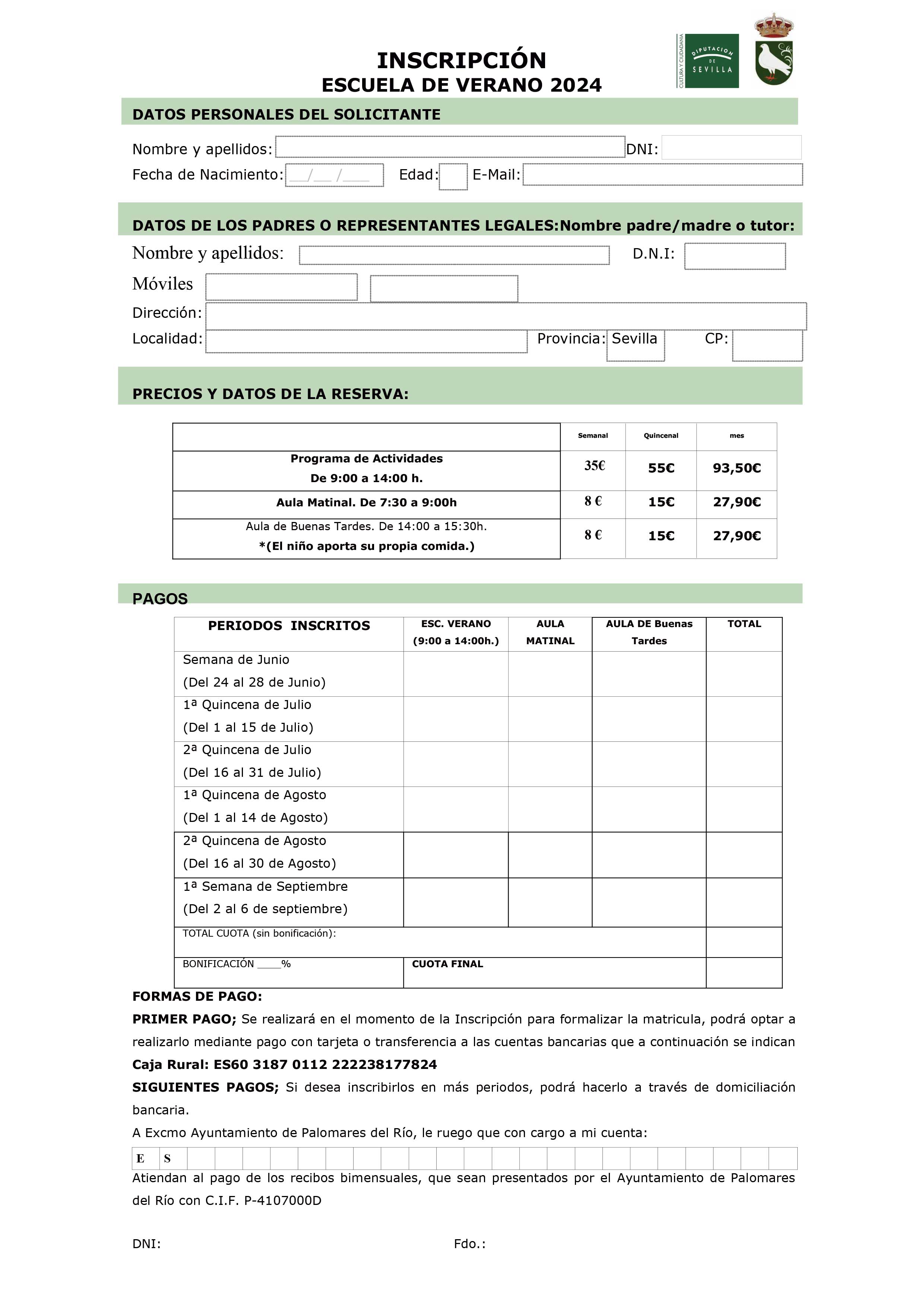 A partir del próximo 27 de mayo puedes inscribirte en la *Escuela de Verano*, presencialmente de 9:30 A 13:30h en el Registro del Ayuntamiento de Palomares del Río (Plaza de Andalucía 1), o a través de la sede electrónica https://palomaresdelrio.sedelectronica.es "Instancia General". Podrán descargar la solicitud a través del canal de Telegram o la propia web del Ayuntamiento de Palomares, o recogerlo en el registro del Ayuntamiento. No se garantiza la plaza si no se aporta todo lo especificado en la solicitud. Plazo de inscripción para empadronados/as. Del 27 de mayo al 12 de junio. Plazo para no empadronados: del 13 de junio al 23 de junio. Plazas limitadas, por orden de inscripción.