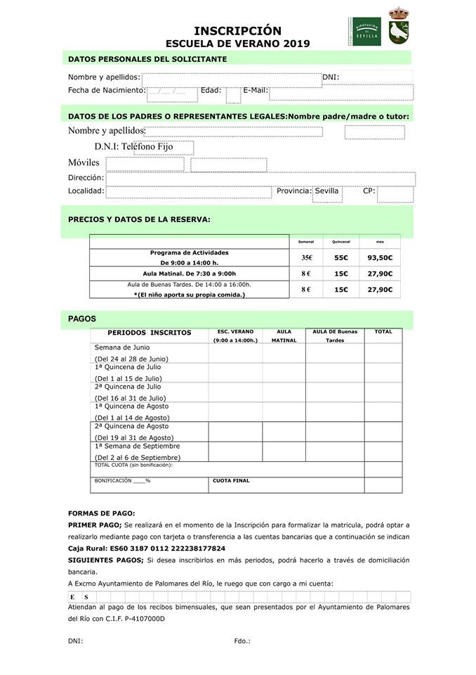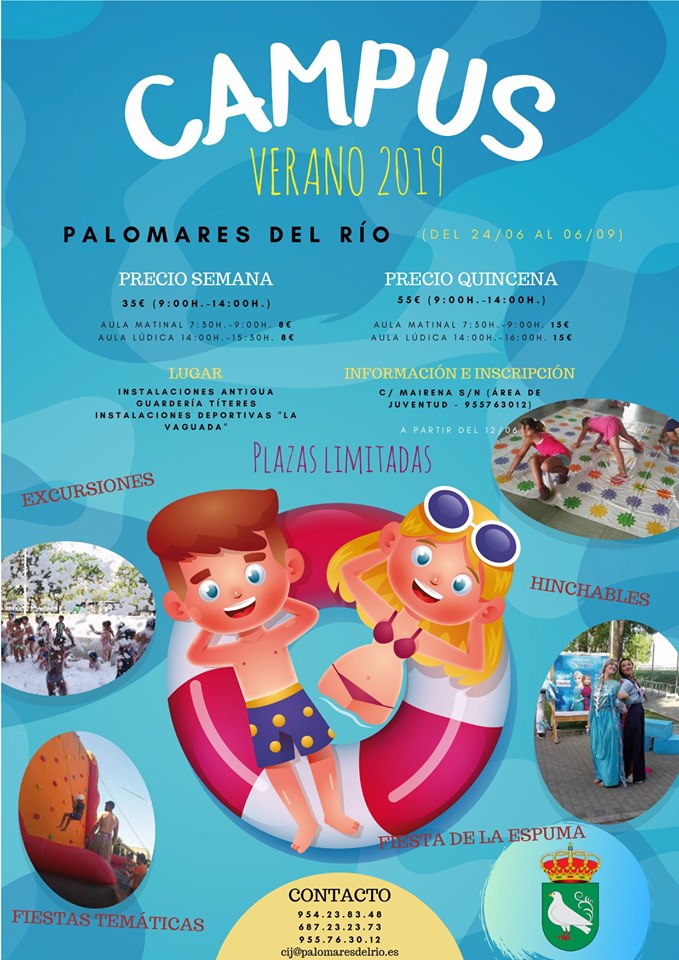A partir de mañana comienza la inscripción para la Escuela de verano de Palomares del Río. Podrán apuntarse niñas y niños mayores de tres años en periodos semanales, quincenales y mensuales. Plazas limitadas por orden de inscripción. Solicitud de inscripción en el documento adjunto. Más información en el cartel y en el Área de juventud de nuestro Ayuntamiento.