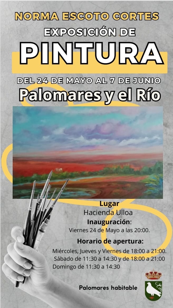 El próximo 24 de mayo se celebrará la inauguración de la exposición de pintura "Palomares y el Río" de la artista Norma Escoto Cortés a las 20:00h en el salón de exposiciones de la Hacienda Ulloa.