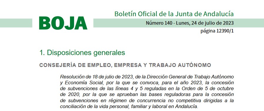 La Consejería de Empleo, Empresa y Trabajo Autónomo de la Junta de Andalucía ha publicado, con fecha 24/07/2023, una convocatoria de subvenciones dirigida a facilitar a los trabajadores autónomos la conciliación personal, familiar y laboral.