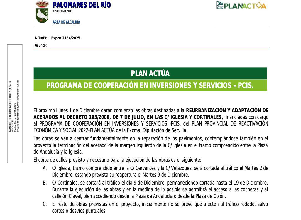 El Ayuntamiento de Palomares del Río informa a la ciudadanía del comienzo de las obras incluidas en el Plan Actúa – Programa de Cooperación en Inversiones y Servicios (PCIS).