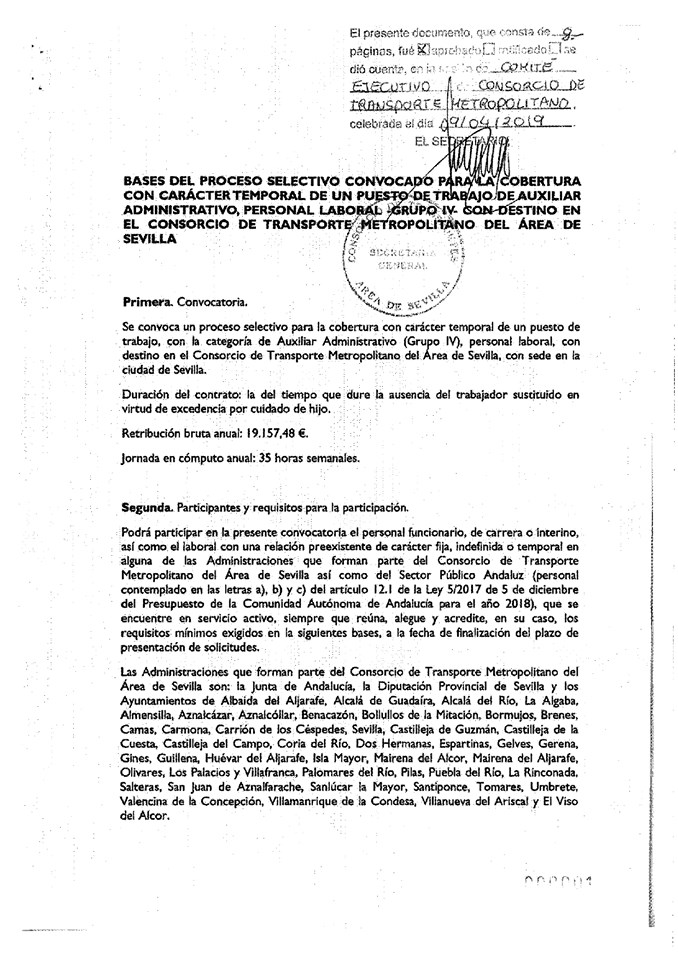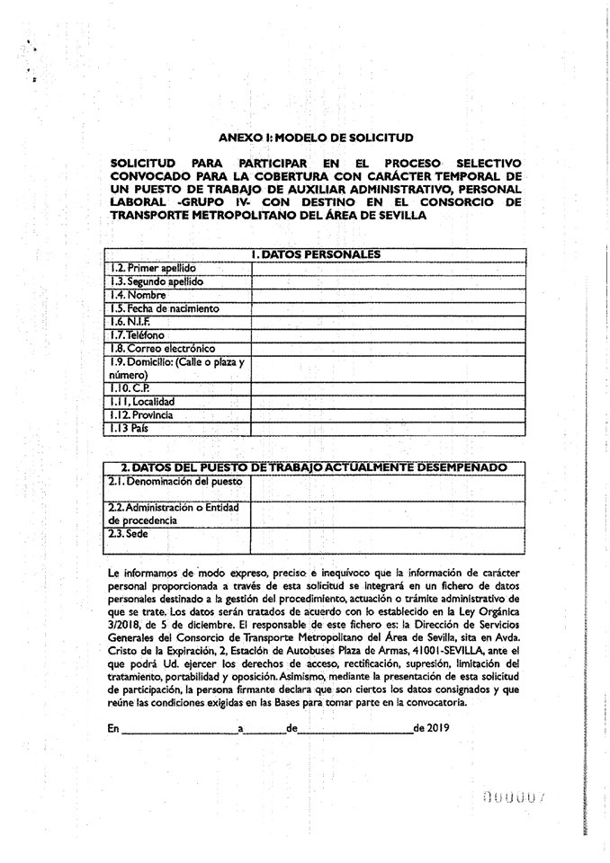 Desde el Consorcio de Transporte nos llega esta oferta de empleo temporal para cubrir una plaza de Auxiliar Administrativo. Adjuntamos las bases del proceso selectivo, el modelo de solicitud y el modelo de autobaremación de méritos. Atención al plazo de 15 días hábiles a partir de su publicación en el BOJA.