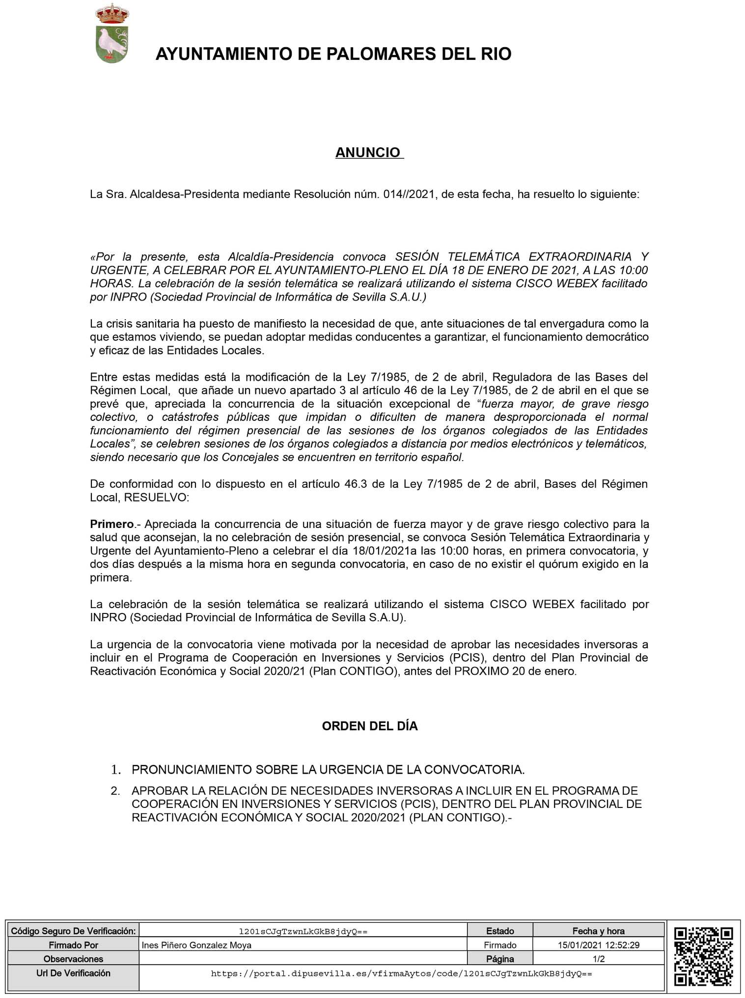 PALOMARES DEL RÍO - 18/01/2021 - SESIÓN TELEMÁTICA EXTRAORDINARIA URGENTE