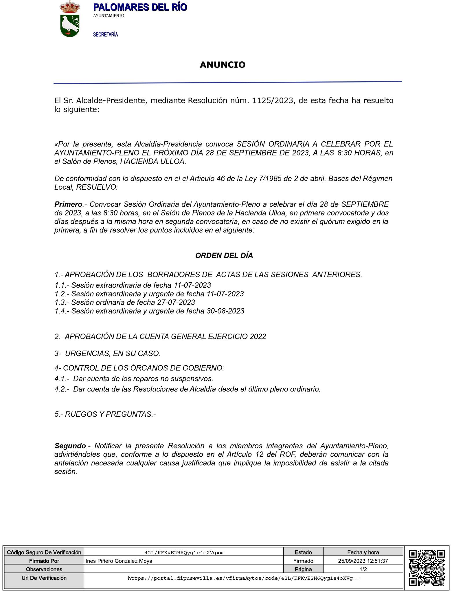 PALOMARES DEL RÍO - 28/09/2023 8:30H - PLENO ORDINARIO