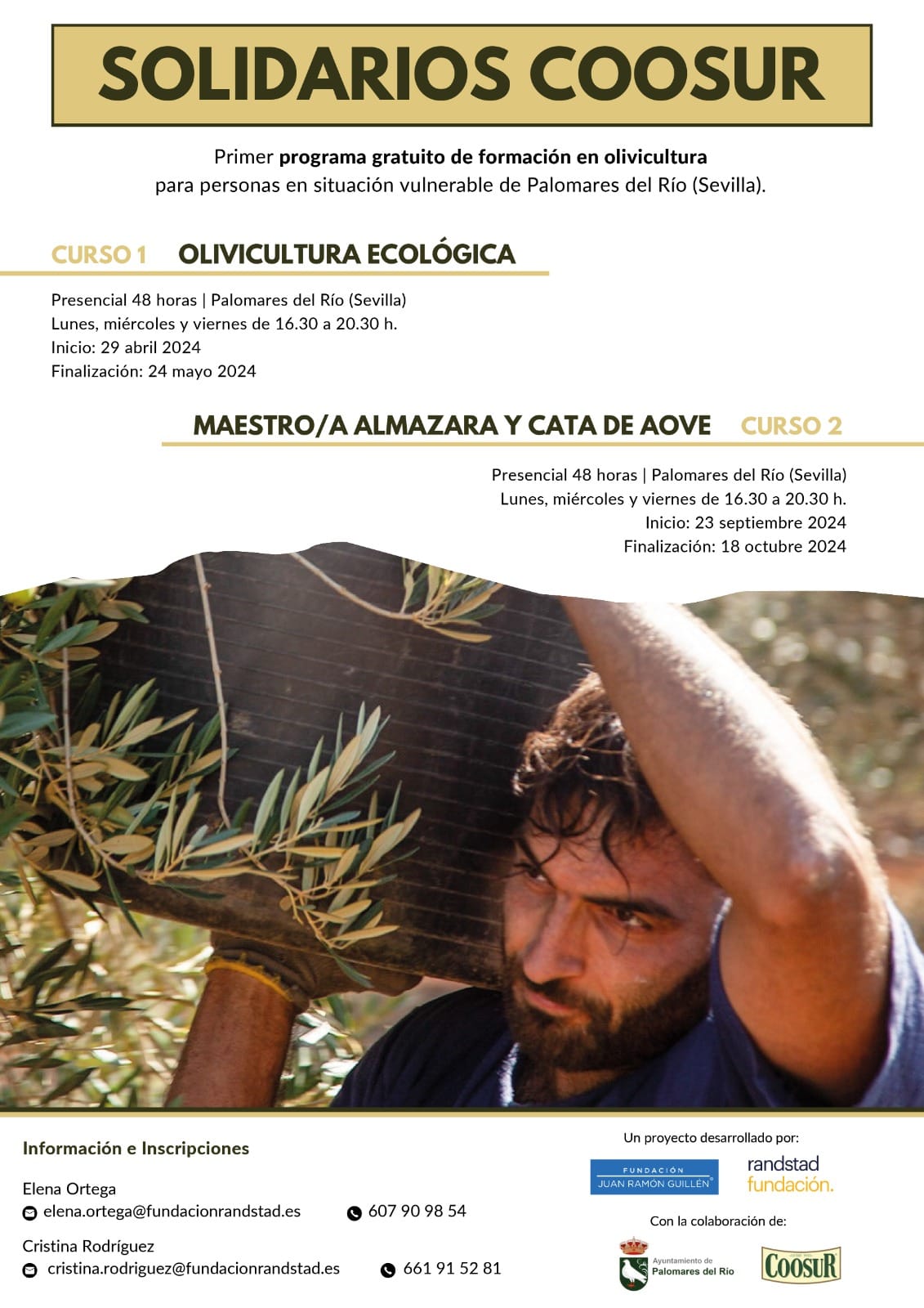 Este programa está organizado por Fundación Juan Ramón Guillén y por Ranstad Fundación, con la colaboración del Ayuntamiento de Palomares del Río y Coosur. Tiene como objetivo brindar formación en el cultivo del olivo de manera ecológica a personas en situación vulnerable, a través de dos cursos.