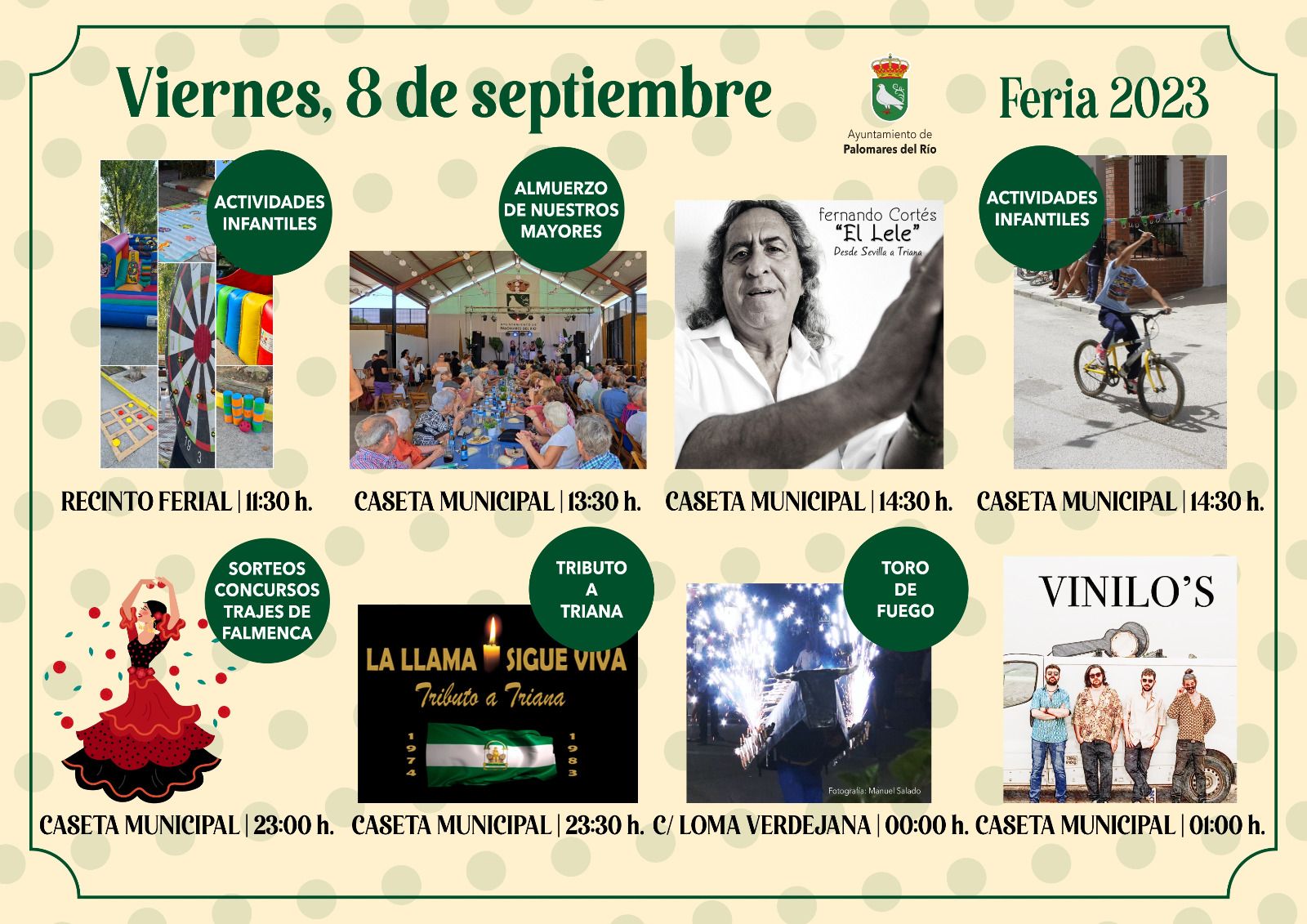 Durante el día actividades infantiles, almuerzo de nuestros mayores y actuación del Lele de Camas en la Caseta Municipal, y esta noche, vente vestida de flamenca y participa en el concurso de Trajes de Flamenca desde las 23:00 h. en la Caseta Municipal. También tendremos a la misma hora la actuación del Tributo a Triana "La llama sigue Viva" y a las 00:00 h. el espectacular Toro de Fuego (C/Loma Verdejana).