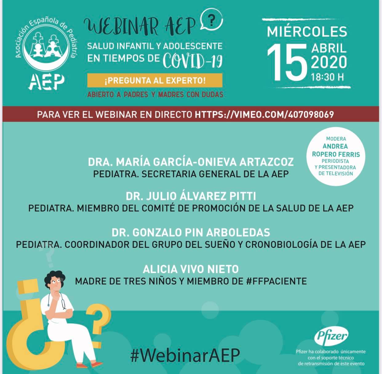 Webinar abierto para resolver todas las dudas de madres y padres acerca de la salud de niños y adolescentes en tiempos de Covid 19, el próximo miércoles, 15 de abril a las 18:30 horas.