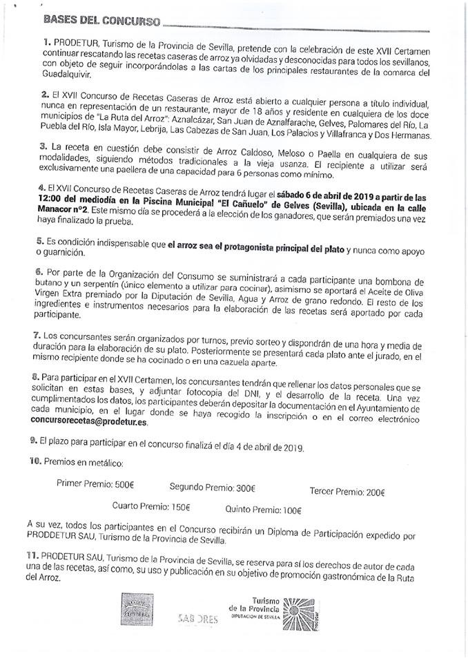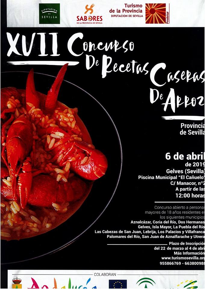 El próximo 6 de abril a partir de las 12 del mediodía se celebrará en la piscina municipal de Gelves (El Cañuelo) el Concurso de recetas caseras de arroz de la Provincia. El plazo de inscripción finaliza el 4 de abril. Para más información, bases adjuntas, www.turismosevilla.org o en el 955866769.